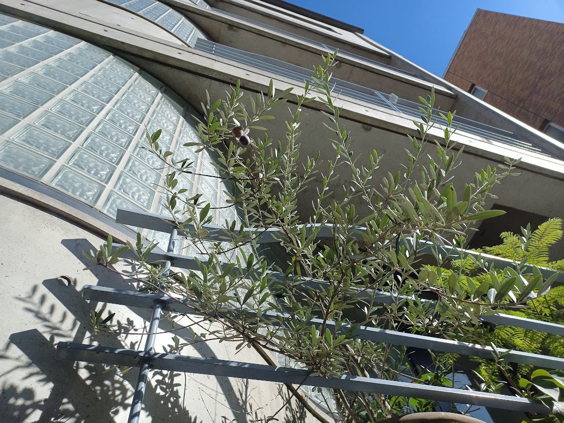 渋谷本社・・・お隣のオフィスのベランダプランターにオリーブの実を発見。小さな空間ですが植物の息吹を感じる植物園!癒されます。。 |