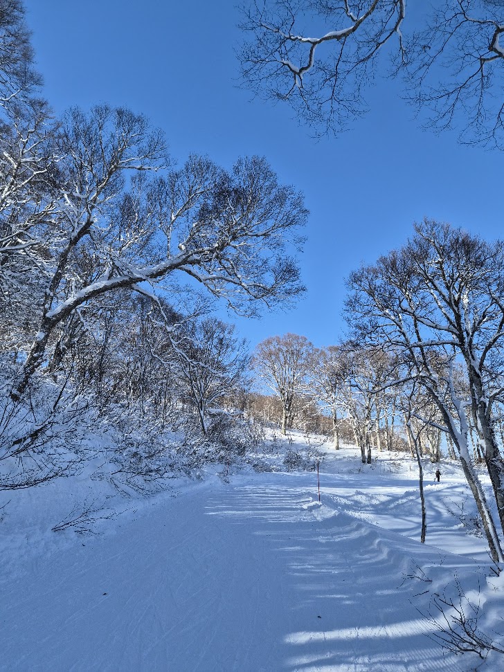青い空、木立、そして真っ白な雪道。。ここには、人が創ったエンターテイメントの世界は何も存在しません。何故か、過去・現在・未来をつなぐ、新たな道筋を想像させてくれます。(野沢温泉スキー場にて)是非〜! |