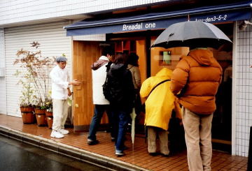 冷たい雨が降り続くとある土曜日の午前11時30分。傘をさした女性がひとり、シャッターの閉まった店の前にたたずんでいた。その女性を横目に見ながら、店の裏にまわり、ドアをノック。中から「どうも」と元気のいい声が響いてきた。オーナーの山岸充さんは、開店を30分後に控え、忙しそうに動いていた。焼きたてのパンをのせた天板が次々とオーブンから出て来て、ラックに差されていく。それを恵子夫人が手際よく陳列台に並べていく。「今日はバターロール少ないの」(恵子夫人)。「いや、そこにもう一枚あるよ」(山岸さん)。 正午の開店時間が来て、山岸さんが厨房の裏から、店の正面に出てきた。「いらっしゃいませ。お待たせいたしました」といいながら、すでに15人ほどになっていた顧客の列の脇を通って、ドアのところに行き、ドアを開け、顧客を招き入れる。「私のパンを買いに来てくださって本当にありがとうございます」という感謝の気持ちが、仕草の端々からにじみ出ていた。 売り場が狭いので、一度に入れるのは3人まで。1人が買い終わったら、一人入って・・・という具合。 Breadal Oneは、売り場が1・5坪ほどしかない小さな店。入り口のドアを開けると、すぐに右手が平台のような陳列台になっていて、パンがぎっしりと並んでいる。その下は、ショーケースになっていて、その中にもパンが陳列されている。レジは平台のような陳列台のすぐ脇にある。恵子夫人が1人ずつ注文を聞いて、パンをとり、包装して手渡し、清算する。清算が終わるごとに恵子夫人はもちろん、厨房で...(月刊ブランスリー2005年2月号へ続く) |